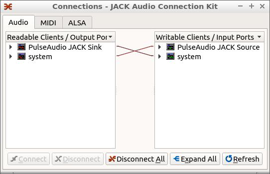 Now when you start Jack in qjackctl you should see the Pulseaudio connections in the Connections screen. You can now connect / route these to any other Jack input / output.