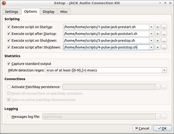 Once you have these scripts created, if you are using Option 2 from above to start Jack the easiest way to use them is to have qjackctl load them up. Set them up like this: